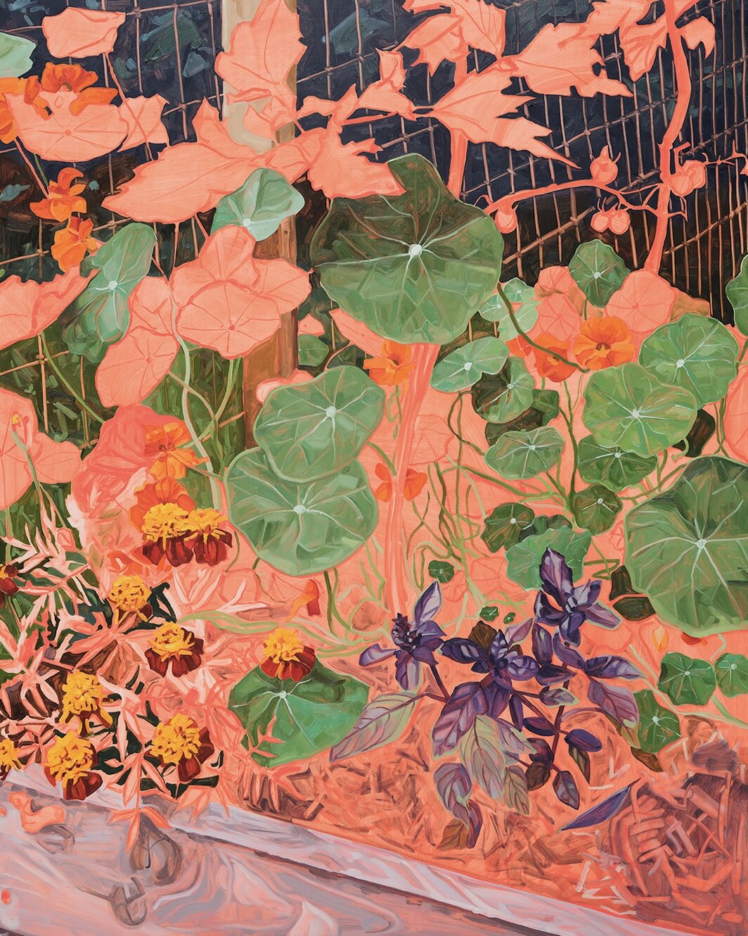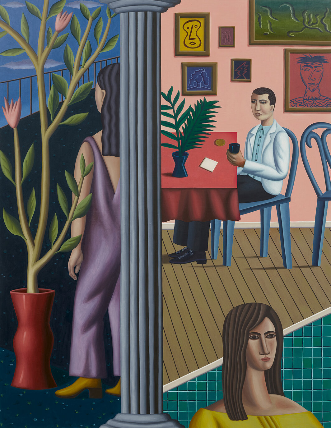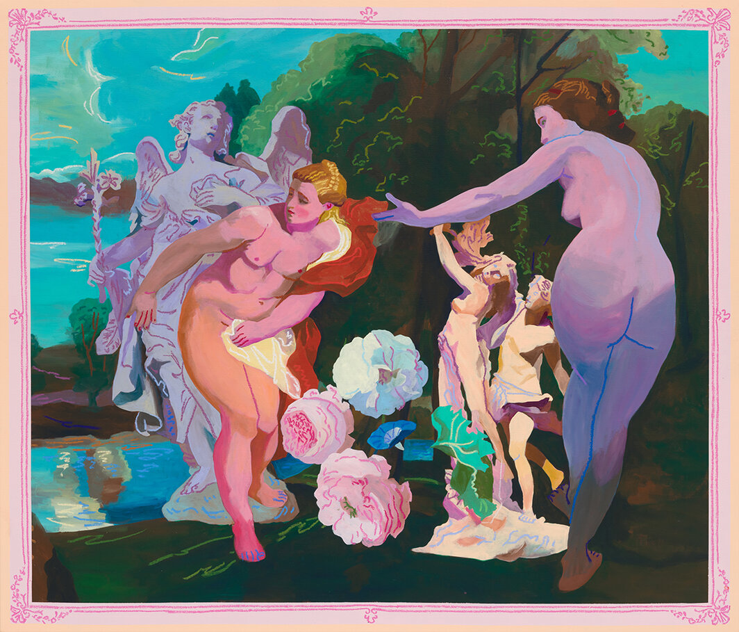 于是才有安迪·迪克森(Andy Dixon)用Day-Glo荧光漆描绘的洛可可式浪漫故事:具有雕塑质感的裸体披裹着松展的衣袍,在点缀着古典雕塑的欢乐园中嬉戏;相似的主题在米凯拉·耶尔伍德-丹(Michaela Yearwood-Dan)的抽象画中凝练成优雅的阿拉伯式花饰和轻柔的涡纹。塞西莉·布朗(Cecily Brown)在纽约大都会艺术博物馆重新演绎虚空画(vanitas)的展览 “死亡与少女”(Death and the Maid)大获好评,以致于一度对她大加批判的罗贝塔·史密斯(Roberta Smith)为此在《纽约时报》上承认自己评判失误,而在近期保拉·库珀画廊的个展中,布朗又重新诠释了老扬·勃鲁盖尔(Jan Brueghel)与彼得·保罗·鲁本斯(Peter Paul Rubens)的寓言式组画《五感》(The Five Senses, 1617–18)。安德鲁·克兰斯顿(Andrew Cranston)通过描绘朦胧的家庭场景,营造出一种维亚尔·爱德华(Édouard Vuillard)和皮耶·勃纳尔(Pierre Bonnard)式的个人情感描绘;而乔丹·卡斯蒂尔(Jordan Casteel)、詹娜·格里本(Jenna Gribbon)、萨姆·麦金尼斯(Sam McKinniss)和珍妮弗·派克(Jennifer Packer)等一众画家则纷纷开始画花,花朵的突然流行似乎到达了自荷兰黄金时代以来从未有过的程度。路易斯·弗拉蒂诺(Louis Fratino)的作品将男性裸体置于轻浅的室内空间,平坦的刻面强化了空间上的不协调感,这种酷儿伪立体派风格被乔纳森·加德纳(Jonathan Gardner)朝向乔治·德·基里科(Giorgio de Chirico)和费尔南德·莱热(Fernand Léger)的方向更推进了一步(立体主义已经和它之前的所有“主义”一样,成为了架上绘画的伟大传统)。