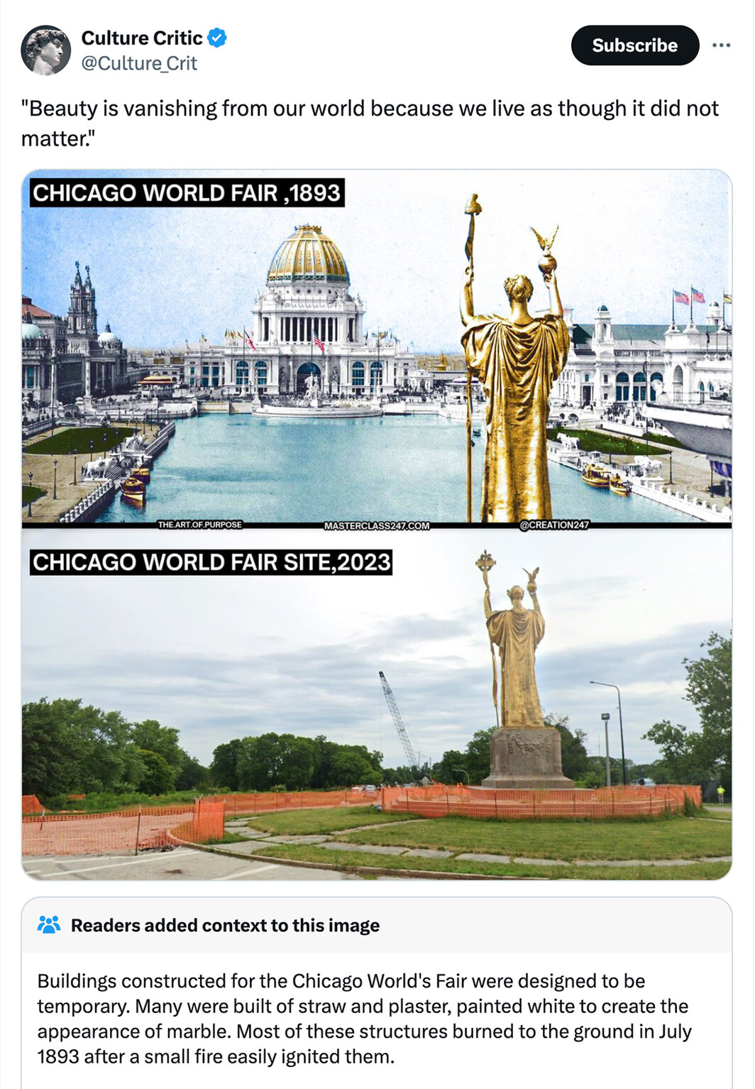 我们不难对这些反动的民粹主义教导嗤之以鼻,因为它们太过肤浅(更不用说偶尔还有法西斯主义倾向): “文化评论”账号之前发过一张前后对比图,图片上,奉行堕落的粗野主义的城市精英任凭一座熠熠生辉的白色城市被灾难性地拆毁,只剩废墟。这条推文发出后,下方就出现了一条“社区笔记”(Community Note,一种事实核查工具),指出图上建筑实际是1893年芝加哥世博会的一个临时展馆:一个用硬纸板和石膏搭建出来的古典建筑的假象。(对这座赝品庙宇的吹捧与“文化评论”、“文化导师”及其支持者们所认可的在艺术史上并不具备连贯性的各种运动及风格的揉杂步调一致:新古典主义,这是肯定的,还有拉斐尔前派、新艺术运动和装饰风艺术。)