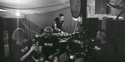 在纽约艺术家德雷克·福乔(Derek Fordjour)首场中国个展上,六幅完成于2021年的新作环绕池社展厅的三面墙排开,一目了然。画面中似乎诉说着一种秩序和节奏,富有戏剧性及仪式感。位于展厅尽头是《全步三重奏》(Full Step Triad),画中三名进行乐队指挥者昂首踱步,各自举起手中的指挥棒;左侧的《海上五重奏》(Thalassic