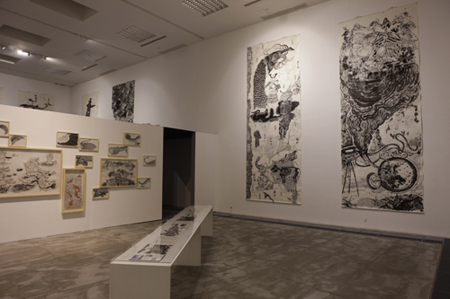 孙逊的新展在很多方面都很令人注目。观众不由自主地被带入了作者精心构筑的世界,在巨大的竖幅画卷上,浓墨勾勒的窟窿,机器,孔雀,武士,不失细节之巧妙。这些手绘作品取材自动画片《主义之外》(2010) ,残缺的龙,扭动的鱼,乌云下的楼宇,呈现出了作者极具原创力的综合美学素养。而那部关键的动画片,则被安排在展厅之间播放。