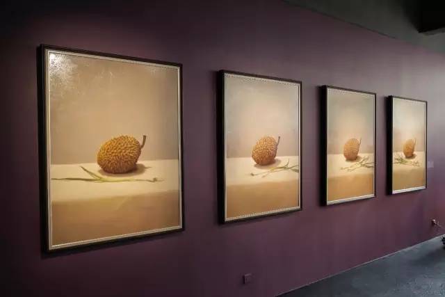 一位艺术史研究者在“榴莲忘返”开幕当晚转发给我一篇媒体报导,并问道:“这是一个玩笑吗?几幅这样的画能算作品吗?”这种“不在场”式的疑问和批评很正常,因为即便在场的观者也可能一头雾水。除了以“榴莲和葱”为主题的四幅油画,现场还充斥着宣传旗帜、易拉宝、海报、花篮、迎宾小姐、司仪、榴莲甜品、画廊门口的对联等等,这些在当代艺术展览开幕上罕见的铺排与阵仗在“林载春精品油画展”里一应俱全。