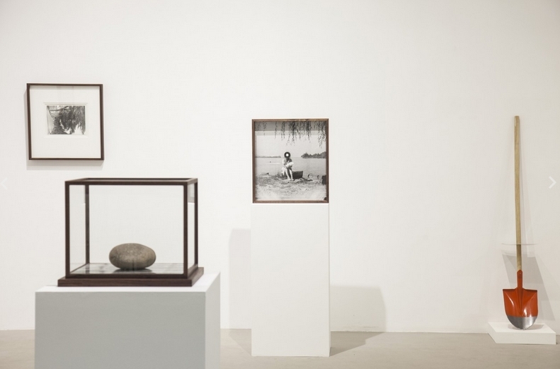 艺术家蔡东东此次新展览“落石”中呈现了其立足于现成照片并根据照片之于其自身的刺点(punctum)所进行的再创作。在作品《学习》(2014)中,他用一把铁锹的把手穿过了记录下新中国成立初期老百姓齐聚学习场景的照片;《摘果子》(2014)里,他掏空了一些原始照片上的水果,将它们置换成一块块小镜子,观看者会发现自己的脑袋和饱满的水果们一道挤在果树上,或是堆在摘果姑娘的篮子里;《路》(2014)中,斜靠在桌边的裸体女性面对面交谈的对象变成了一张对半折叠的照片——一位推车老者正在乡间小道上驻足观望。