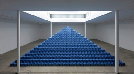 观众经过一个院子进入KW协会,展览的场地就位于一条狭长的走廊尽头。如果你有幸成为第一个参观该展览的人,你就会看到地下展厅里矗立着一座用蓝色纸箱整整齐齐堆起来的金字塔。我到的时候金字塔还没走形,但箱子里面却被彻底翻腾了一遍,因为里面藏着72000瓶免费啤酒,观众可以拿走、送人、喝掉,或者随意处置。展览结束的时候,金字塔的形状已经面目全非了,只留下一堆湿透的纸片和一圈碎玻璃,就像经历了两个月的狂欢之后柏林的一家俱乐部的狼藉景象。