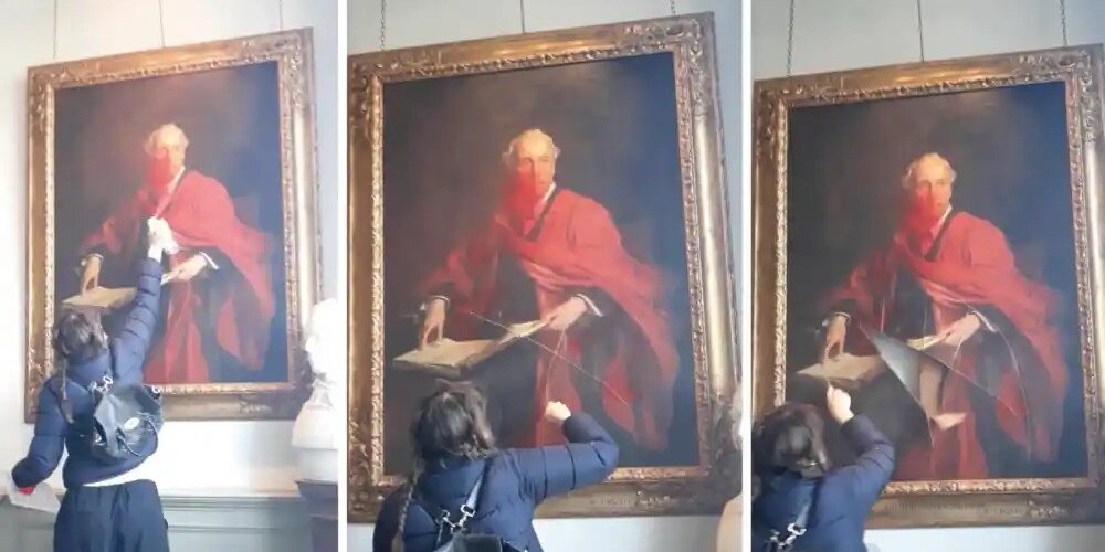 3月8日,社会行动组织“巴勒斯坦行动”(Palestine Action)在X上发布了一段视频,显示一名抗议者正在剑桥大学三一学院破坏一幅由菲利普·亚历克修斯·德·拉斯洛(Philip Alexius de László)1914年创作的贝尔福勋爵(Lord