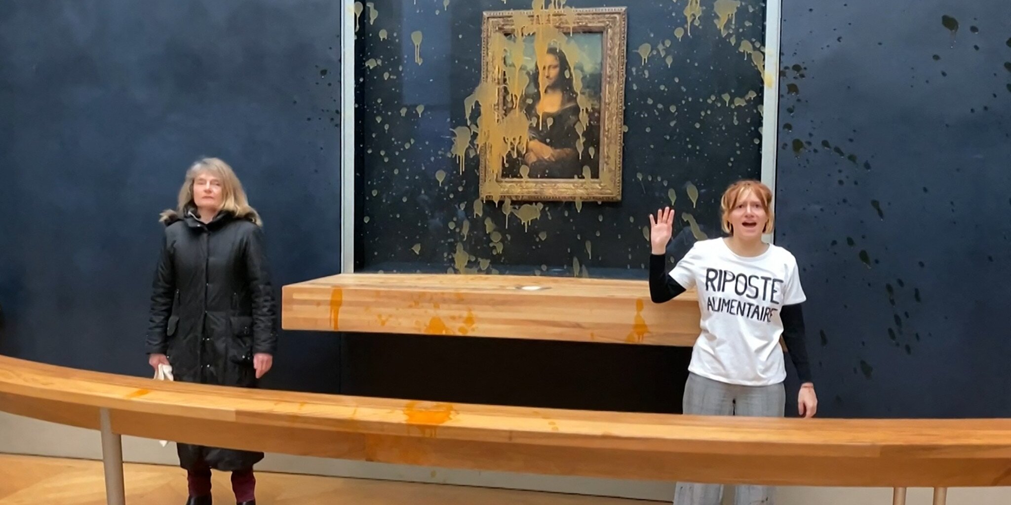 1月28日,两名环保抗议者进入巴黎卢浮宫,向《蒙娜丽莎》泼洒南瓜汤,意在提高人们对粮食安全和法国农民困境的关注。