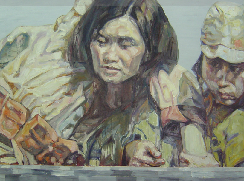 “浪子归”中的整组画,是以1949年摄制的电影《中华儿女》为蓝本而创作。 作品线条粗砺,笔触凌厉,色彩分明,以再现电影镜头的画面再现了八女投江的悲壮故事。 出生在长春的刘虹,八十年代初赴美,在海外举行过多场展览。“浪子归”是其赴美回京后举办的首场个展,题目在此产生了双重寓意。在异国笔耕不辍的她,素材来源却常常是对中国历史的回忆和反思。与其说是对国家历史的念念不忘,不如说心头萦绕的是中国人永远挥之不去的乡愁,只是这种乡愁因创作者成长年代的特殊,转化成了一幕幕不是那么诗意的历史图景。