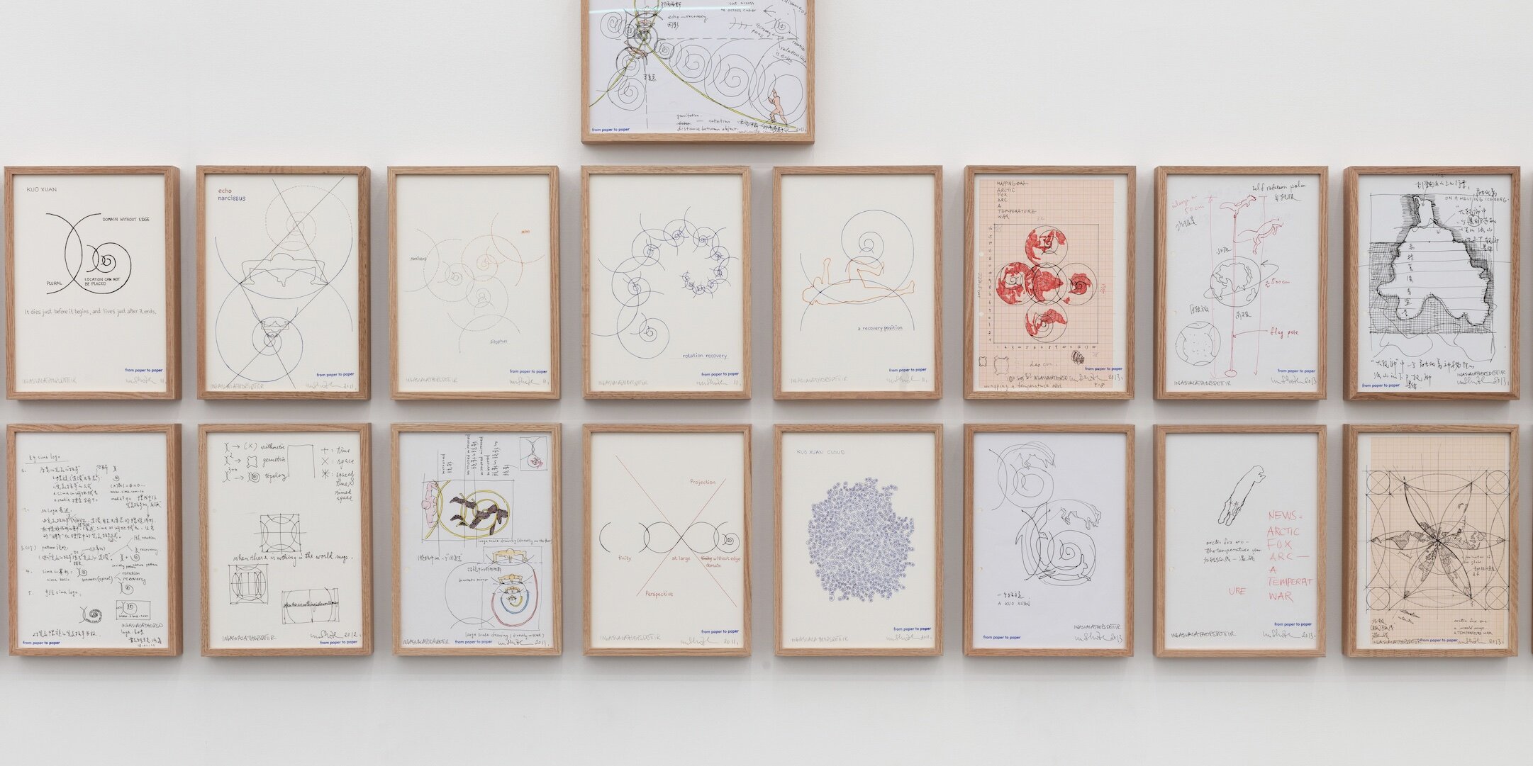 距离上一次吴山专于长征空间的展览“今天后来成为了节日”(由英格-斯瓦拉·托斯朵蒂尔策划)已逾四年,但那由绘画占满所有墙面、似乎呼应着吴山专本人1986年作品《大字报》的现场仍历历在目。因而在印象中,他们的展览始终都是对其自我艺术信条的某种毫无保留的身体力行:一切艺术品都是例如物,所有“括号”内的空白都有待被(例如物)注入。相形之下,本次展览“从纸到纸”中,以展墙宽度为限,以手稿为单位,两列上下左右等距的编年陈列,使得现场看起来极为克制。