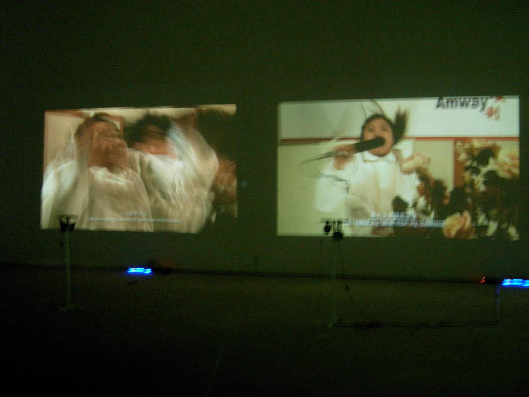 周啸虎个展的现场被布置为巨大的放映厅:展厅的几面墙上用大屏幕投影仪放映着安利驻中国公司对员工的培训场景。录像装置作品由八个部分组成:《超越自我》、《集体造梦》、《财富讲坛》、《分享泪水》、《集体谋略