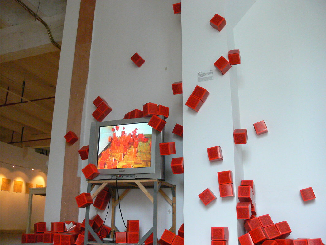 “杭州残联主席”陈晓云在他的录像《狴》里,再次表现出对畸零人、鞭打和绳子的爱好,十台湖蓝色大卡车围困着一名男演员,洒水车淋下倾盆大雨,泥泞中,演员持鞭而立,不时鞭打泥地。因为标题奇特的发音:BI,我们都猜测是艺术家自己发明的字,陈晓云辩说:“有这个字,古代的一种兽,代表‘禁锢、驱赶’,就是门环上的那只。”