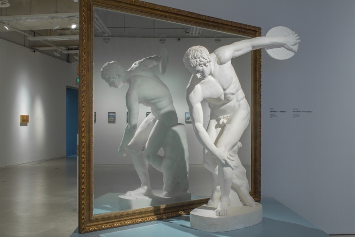 在上海当代艺术博物馆“Copyleft:中国挪用艺术”中,尽管策展人试图用“临摹”、“挪用”和“山寨”三个关键词来结构二十多位艺术家的一大堆作品,它仍然呈现出一副“迷人”的涣散面貌。陈幼坚用蛇皮袋材料做的LV包包散落在地下,杨振中从网上下载并以原作尺寸强行打印出来的充满马赛克的“名画”挂在墙上,叶甫纳那些披挂着小灯串的火树银花和假山水灯箱仿佛节日过后不甘被遗弃,拼命亮着,耳边则回荡着周铁海的声音装置《机场》(1996)中的登机广播。王冠山的《观》(2014)更加“惨不忍睹”,他以艺考生的拙劣素描为样板,还原他们作画时观看的石膏像,结果就出现了激光电眼阿格里巴,老巫婆伏尔泰,黑人兄弟美第奇和梯田脸“海盗”阿里斯托芬。
