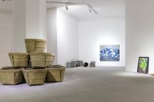 展览海报很容易让人产生“这是一幅画”的错觉:一堆错落有致的黄色竹篮被整齐的码放在土黄色墙壁与蓝灰色的地板之间,竹筐表面粗糙的肌理无意中和墙体与地面斑驳的质感产生了视觉节奏上微妙的呼应,以至于使人一度怀疑竹筐是从墙面和地板的缝隙中自由地生长出来,而非来自于艺术家对身边之物巧妙的挪用与搭配。海报里的这件名为《时钟》(1995)的作品出自艺术家朱金石职业生涯早期的“公寓艺术”时期,并被重新摆放于上海艺术门的画廊空间,重新演绎历史,从而成为了“甘家口303——朱金石个展”中几件核心作品之一。只不过当作品从90年代的质朴公寓被移至白墙与水泥地面构成的展览空间里时,作品与环境之间的有机统一被全然打破,取而代之的则是必须借助文献才能得以阐明的艺术史叙事。