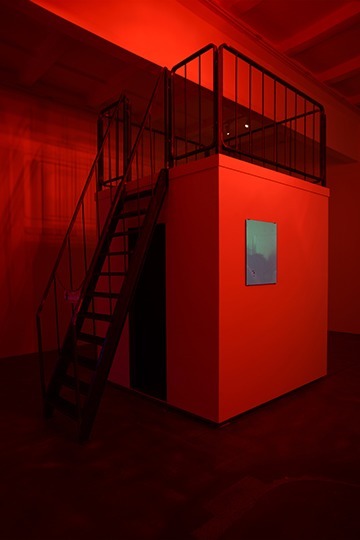 从Para Site十楼窗口望出去是香港殡仪馆的水泥穹顶,现代主义风格的连续弧面之后,霓虹招牌显露幽蓝一角。杨沛铿在展厅窗户上贴上蓝色滤纸,蓝色光线洒满整个昏暗的空间。进入其中,脚下是蓝色瑜伽垫铺成的充满弹力的地面,四围通顶圆柱装置如树林般排列疏密有致,展厅正中横卧一段巨大的树干状雕塑——一个浸润在无声蓝色里的幻觉空间,在工厂大厦的室内暗示着户外某处,带着既私密又公共的矛盾气质。窗外的历史和现实退作了遥远的背景。