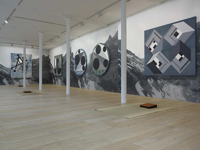 赵要在伦敦的首次个展中呈现给观者叙事史诗般的观念艺术。7幅绘画作品布满整个展览空间,而“衬托”它们的则是墙面上巨大的黑白藏区实景图像,此外,4张草席和相册分置在大小两个展厅的地上。赵要在牛仔布上用中性色重新绘制了一年前在北京公社《很有想法的绘画》系列中出现的抽象几何形状,这些作品在北京完成以后,艺术家带着这些作品一路去到青海接受活佛加持,然后原路返回。600张纪实照片记录了这次公路旅行,并收录在展出的相册里。