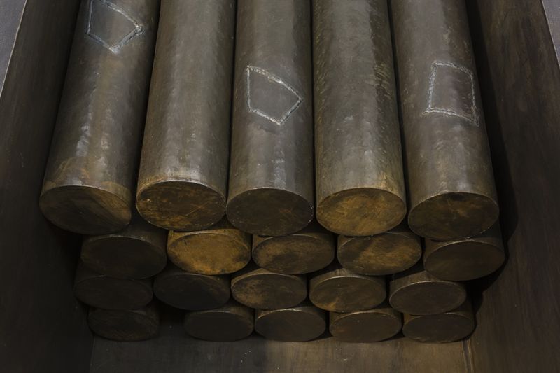 闫冰以往作品的最大特点可能就是拥有土地与自然的温度,牛皮、树桩、稻草、泥土、麦子都是他会经常运用的材质,但在近期的个展之中,他用一种近乎“冷酷”的方式试图挣脱过往创作给人带来的既定印象。一进入展厅,黑色的铁皮长方形容器便方正地出现在观者视线之中,细长的圆柱体整齐地排列于其间,在金属冷峻光芒的暗示之下,这一视觉符号似乎成为给人带来沉重死亡