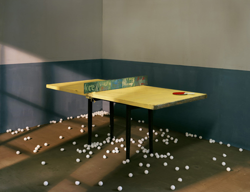 陈维的摄影,细腻地呈现了世间万物的存在状态。他在上海的首场个展里,不乏优秀之作,如其中的一张图片上,是一个人工的乒乓球桌,临时搭建的木板上涂了黄色的油漆,中间的隔板,是More牌香烟盒剪开后拼贴而成的。球桌的一边是一个球拍,它的球把儿显得很突兀。地面上都是凹陷的小球,是之前的比赛留下来的。阳光在寂然的室内留下午后的踪迹,洒下了窗框的影子。此时此刻,白日已逝,欢愉不再。