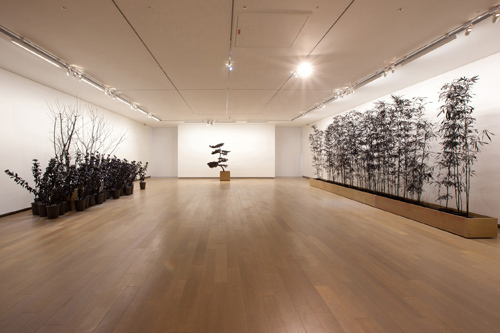 在展览《空中墨花园》(2012)中,马文(Jennifer Wen Ma)展现了她近期的艺术实验,探索了墨的有机特质。这件作品的灵感来自于新巴比伦国王尼布甲尼撒二世(King Nebuchadnezzar II)为了缓解王妃思乡情绪而建造的神秘空中花园。而马文则采用墨汁涂抹过的叶子来建造这件塔形结构。在展览期间,这些植物将继续沿着狭长的展厅延伸生长,从厚厚的墨层下不断长出新鲜的绿叶。