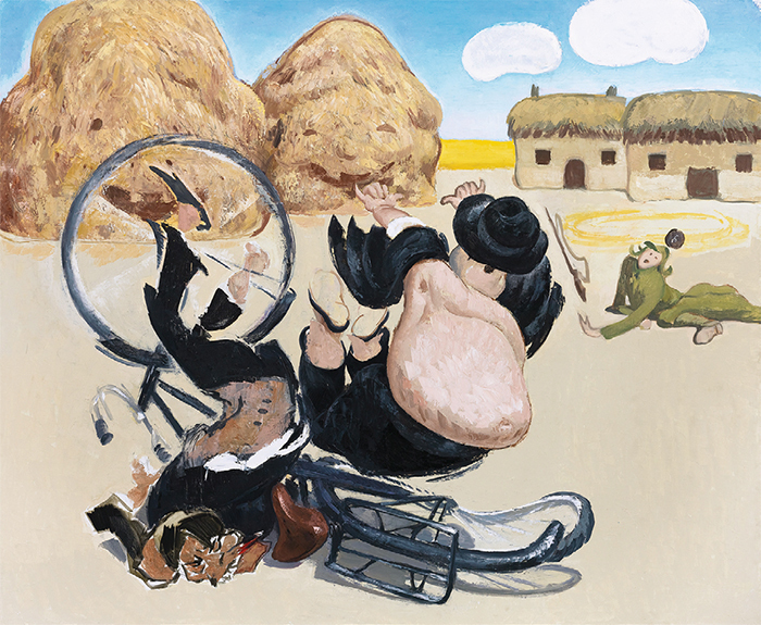 王兴伟最新的个展显然是受到了站台画廊新空间的启发,在观念框架上与展厅的前后关系结为一体,构成了一种二元对立的展览结构。展览主题强烈的摆出了道德价值,王兴伟邀请了一位道德劳模,同时极富传统儒家知识分子色彩也自称“乡绅”的老栗来题写展览标题,在传统中国社会,德高望重的人士也常常担当仲裁者的角色。但如此大张旗鼓的“宣讲”荣与耻,很难不让人觉得有一丝“讽刺与幽默”,因为就在前几年“八荣八耻”还是中国官方热衷的道德主义教育的口号之一。不过,王兴伟很大程度上是在把道德主义的形式当作一种美学内容来使用,比如油画旁边的打油诗,主题是歌颂或揭露,这种被《延安文艺座谈会讲话》所加持的民间传统中的道德主义内容被他用一种油滑的书法风格抄写,并装裱成传统卷轴,挂了出来。