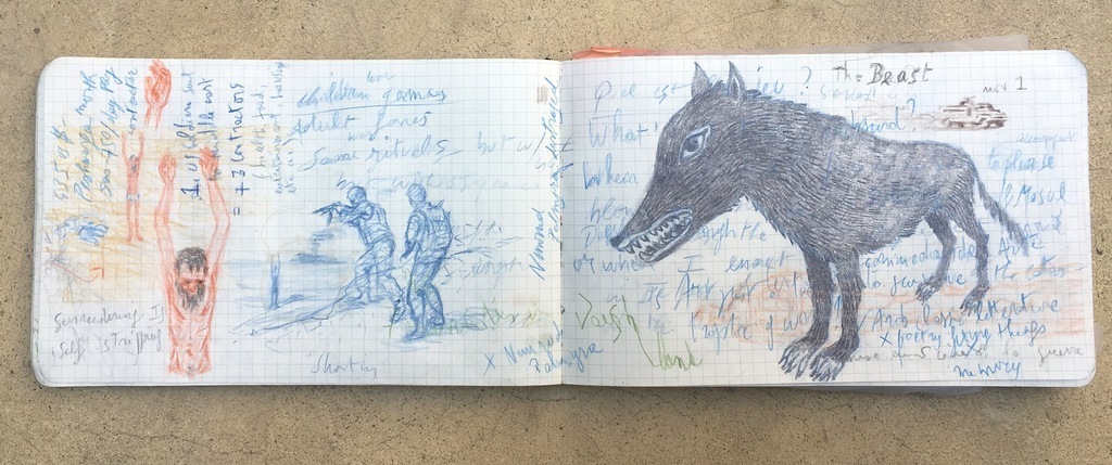 在Ruya基金会的邀请下,艺术家弗朗西斯·埃利斯(Francis Alys)从2016年10月到11月在摩苏尔前线与被称作“自由斗士”(Peshmerga)的库尔德部队中过了九天随军生活。摩苏尔市是伊拉克第二大城市,库尔德部队的目标是将其从ISIS手里解放出来。本文中,埃利斯分享了他随军期间记的笔记,内容涉及艺术家在战争中的角色,游牧生活和恐怖暴力的现实。他在摩苏尔市创作的绘画作品将作为伊拉克国家馆展览的一部分,于2017年5月13日至11月26日在威尼斯双年展上展出。