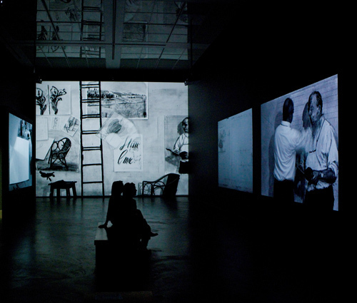 展览《生产地点》强调,工作室不仅是一个干活儿的地方,它本身也是一个强烈的审美题材。贴着展厅外墙的展览《艺术家工作室的视觉史》(selected visual history of the artist’s studio)包含了众多标志性的图像:将自己的身体投向了一幅“行动”绘画的波洛克、在纽约工作室中手持喷灯的Lee