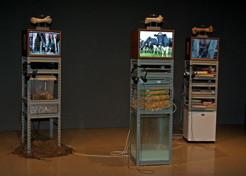 Transjuicer代表了几年来为制作骨扬声器而对骨基质的压电性的研究的顶峰。牛骨扬声器,也是压电转化器,实际上在转化什么呢?从纯物质角度来讲它转化电磁波--在牛曲和骨曲的例子里--成为纳米声波振动。这些振动被激光干涉仪记录下来,并可以用耳机收听。在另一个层面上,扬声器在宏观社会环境和微观机械干预之间转化,在牛和画廊之间,在死亡和生命之间,在科学操作和其再现之间转化。