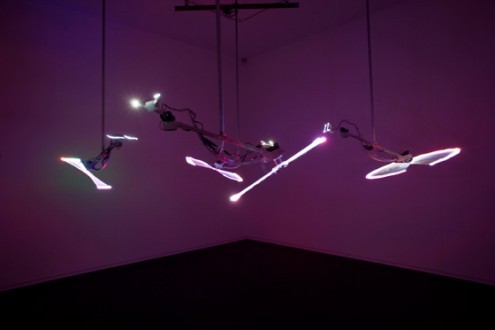 作为一份关于杂交的袖珍宣言,《无声攻击》(Silent Barrage)预示了一种共生的未来,在此未来中,科学家和艺术家,技术人员和设计师携手合作,创造出一种后笛卡尔式的,具有知觉和智力的动物机器。在此未来中,动物和人类的灵魂或许具有相同的地位,跨越了艺术惯常的象征性。在《呼吸》(Breathing)中,古托•诺布莱嘉(Guto Nobrega)证明了由植物和人工系统结合而成的混合的新生命形式的存在。其生命来自呼吸带来的能量交换。人工智能在数字当代毋庸置疑。纽约最近到处张贴的一张海报上这样问道:“今天你杀了多少机器人?”这似乎预见了一种对无法回避的未来情景的逐渐的认知,在这样的未来中,人们将就后人类状况的道德问题展开辩论。《表演的生态》(Performative Ecologies)展现一个舞蹈的场景。敏锐的社交机器人向观众致意并尝试和他们友好地交流。《鱼与鸟系列》(Fish-BirdSeries)力图为不可企及的跨物种的爱情制造一场约会,只有观众温柔的介入才能使鱼和鸟之间的交流成为可能。