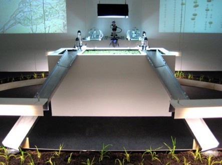 社会景观在《绿云》(Nuage Vert)中以叹为观止的景象再次亮相。但艺术家组合Hehe将敬畏和仰慕转化为一个告诫的场所,一个关于消费社会无可推卸的罪证的所在。艺术家李晖则以一个具有数学可能性的奇思妙想探讨了过渡消费的问题。他的公式是,未来的人类应该变的矮小以便减少资源的消耗。安迪•格雷西通过对一种简单有效的东亚传统农业技术进行艺术置换,将其转化到亢烦复杂的科学实验室来嘲讽技术的过剩。格雷格•尼迈耶(Greg Niemeyer)和克里斯•谢夫(Chris Chafe)在《西红柿五重奏》(Tomato Quintet)中显示了二氧化碳的浓缩,有趣地使观众参与到西红柿成熟的音响化过程中,以富于启示的方式使观众意识到臭氧损耗的问题。戴安•兰德里(Diane Landry)将人们对大自然可悲的短视态度和宇宙时间的永恒性尖锐地对比起来,进而反思水资源日益减少的现象。简•廷利(Jane Tingley)在《植物(Ipod)》(Plant (iPod))中使用计算机和植物构造了一个迷人的森林,生动而逼真,显示了一种新的混合生态正在形成。这些艺术家在他们的作品中展示了艺术在唤醒社会意识和推进批判立场方面的象征力量,而其他艺术家则以真正的介入和具体策略将其计划付诸实践。厄休拉•达姆(Ursula Damm)设计了一个《温室转换器》(Greenhouse Converter),这是一个促使二氧化碳转化为氧气的水生态系统。肯• 罗纳尔多(Ken Renaldo)和艾米•杨斯(Emmy Youngs)组成的艺术家二人组创作的《农场水池》(Farm Fountain)不仅是一件雕塑作品,也是一个由植物和鱼类构成的微型的水产农业复合养殖(aquaponic)群落。英尼斯•克拉斯克(Ines Krasic)寻求在《香蕉之诗》(Banana Poetry)的旋律中找到一种替代能源,而奥隆•卡茨的《自养体》(Autotroph)既是一件制作精良的太阳能设备,也是一件形式完美的典雅雕塑。