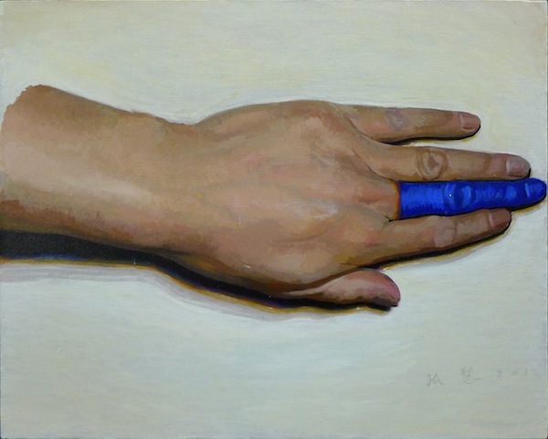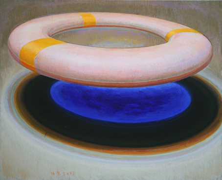 就像我们在《蓝图·快感》中直接看到的那样,蓝色雪片破坏了原始图像(《新年快乐》,2009-2010)。在《新年快乐》中,被处理成卡片的画面和雪本身的体量感之间本身就构成一组反对关系,而《蓝图·快感》里的雪片又再次强化了这一矛盾。同样的,《蓝图·意外》中被砍掉树枝的蓝色截面,对图形的运用与《向下·盲道》(2009)中被自上而下的视角压缩成的不规则的黑色“污迹”相呼应——一只脚提示了现实时空的在场——只不过在《蓝图·意外》里,这组关系更为模棱两可:截面来自树,或者也可以说,先有了这些蓝色的平面图形,树才得以在画面中向深处生长。这些关系是针对绘画和视觉问题的讨论,同时也构成了叙事性上的延续,在张慧的绘画里,这两者往往是捆绑在一起的,与其说是艺术家所称的“勾引”,不如说是他在试图阻止一种“顾此失彼”的观看。《蓝图·聚集》中的安全帽曾经在《无题(围观2)》(2011)中出现,而在人的形象消失之后,仅仅是观看角度留了下来,被压缩至不见的人的形象对应的也可以是绘画中的深度问题。在《蓝图·蔓延》中也是如此,虽然画面内容看起来和2011年的《无题(围观5)》几乎是一样的。此外,最易引起人注意的是“蓝图”系列中的线,它们延续了此前“霓虹灯”系列中对线的研究,但赋予绘画的线以“物质性”是和描绘浮雕一样“无用”的行为(《浮雕·听》,2011-2012)。再比如用平涂的丙烯制造一种颜料堆积的效果(《蓝图·结果》),都像是在绘画经历了从再现到抽象再到“不可能”后再度面对自身传统和当下文化环境时无法避免的一种自相矛盾。而在《蓝图·脚印》里,蓝色的鞋印是提示绘画不可抗拒平面性的重要证据,揉皱的纸张充当背景,将平面和深度的关系再次颠倒错乱——在这些画里无法找到任何的绝对,哪怕是虚拟的绝对——一切都是相对的。类似的矛盾和转换关系在张慧的绘画中比比皆是,技巧看来并不复杂,如艺术家所言,单张绘画必须在他搭建出的整个结构中找到对应关系和合理性。每张画都仅是和整体的一种关系。